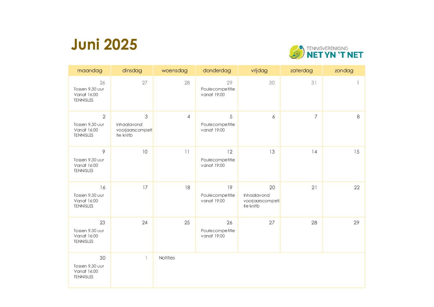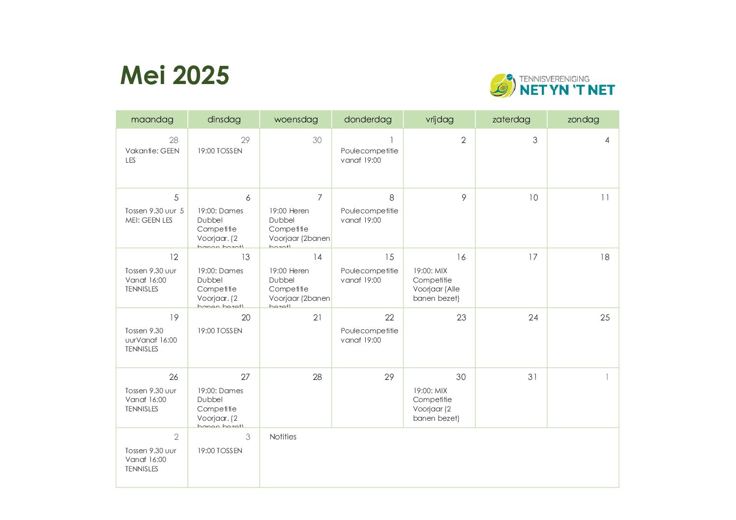 Hieronder vindt u de kalender voor de baanbezetting van de tennisbanen. In dit schema kunt u zien welk aantal banen bezet of vrij is per weergegeven dag. Bent u opzoek naar de kalender en indeling voor de poule competitie? Kijk dan onder het kopje poule competitie voor meer informatie.